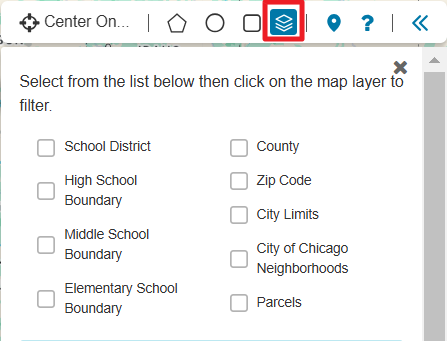 Workaround: If you hover over Search at the top of the MLS and click on Map Search from the drop-down, you will be taken to the General Search Map. In the upper-left corner of the map, click Center On to center on a particular address, then click the layers icon to open up the different overlay options.