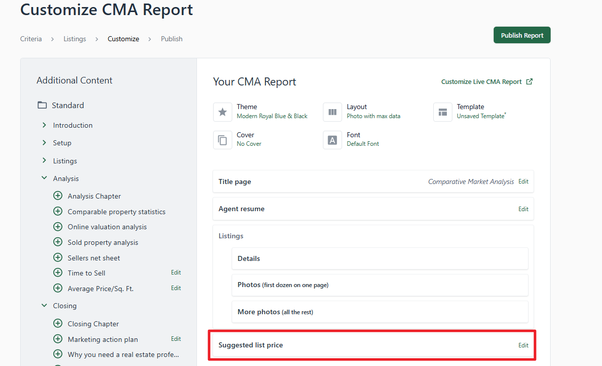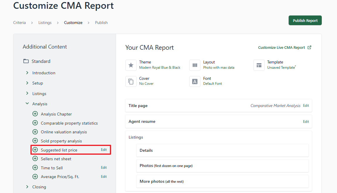 In order for the "Suggested List Price" page to display in your published Cloud CMA report, you must first input a suggested list price under the Listings section of your CMA: